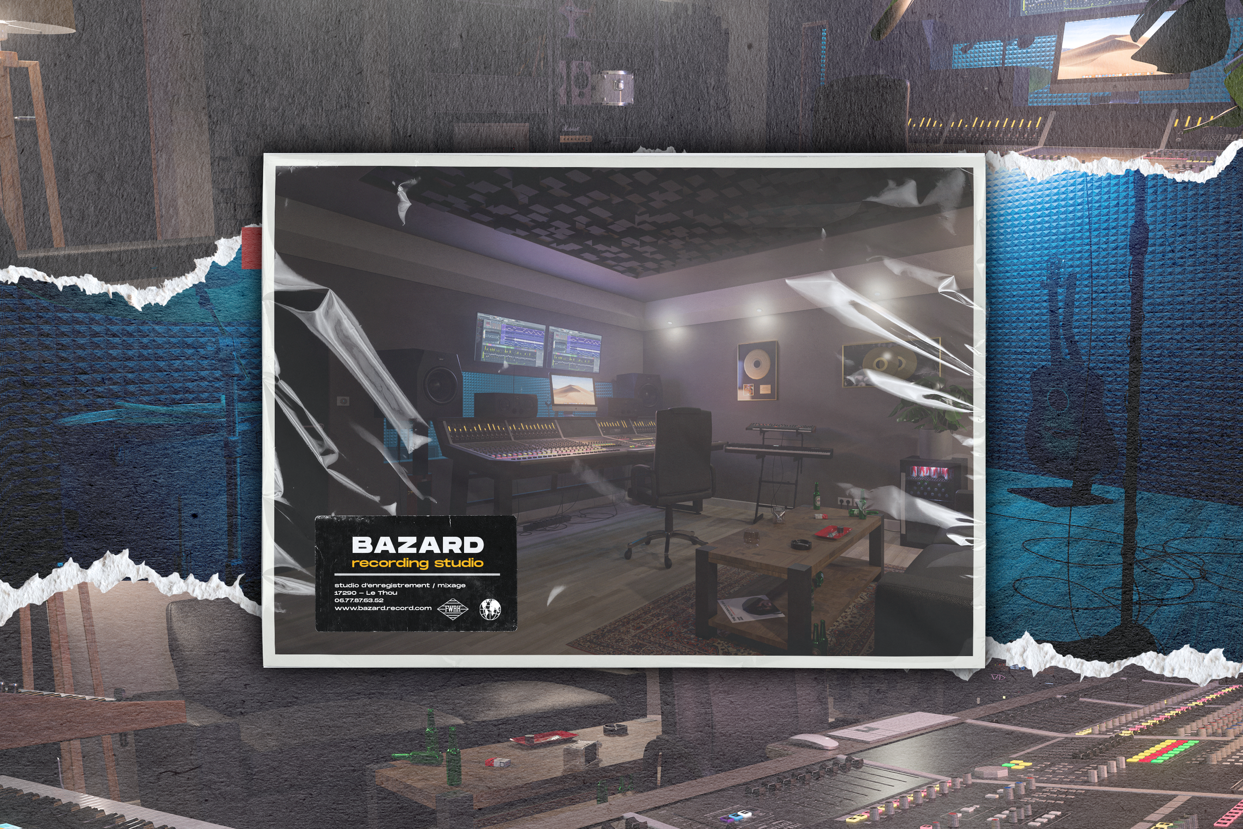 Cabine et régie d'un studio de mixage et d'enregistrement, entièrement réalisées en 3D.